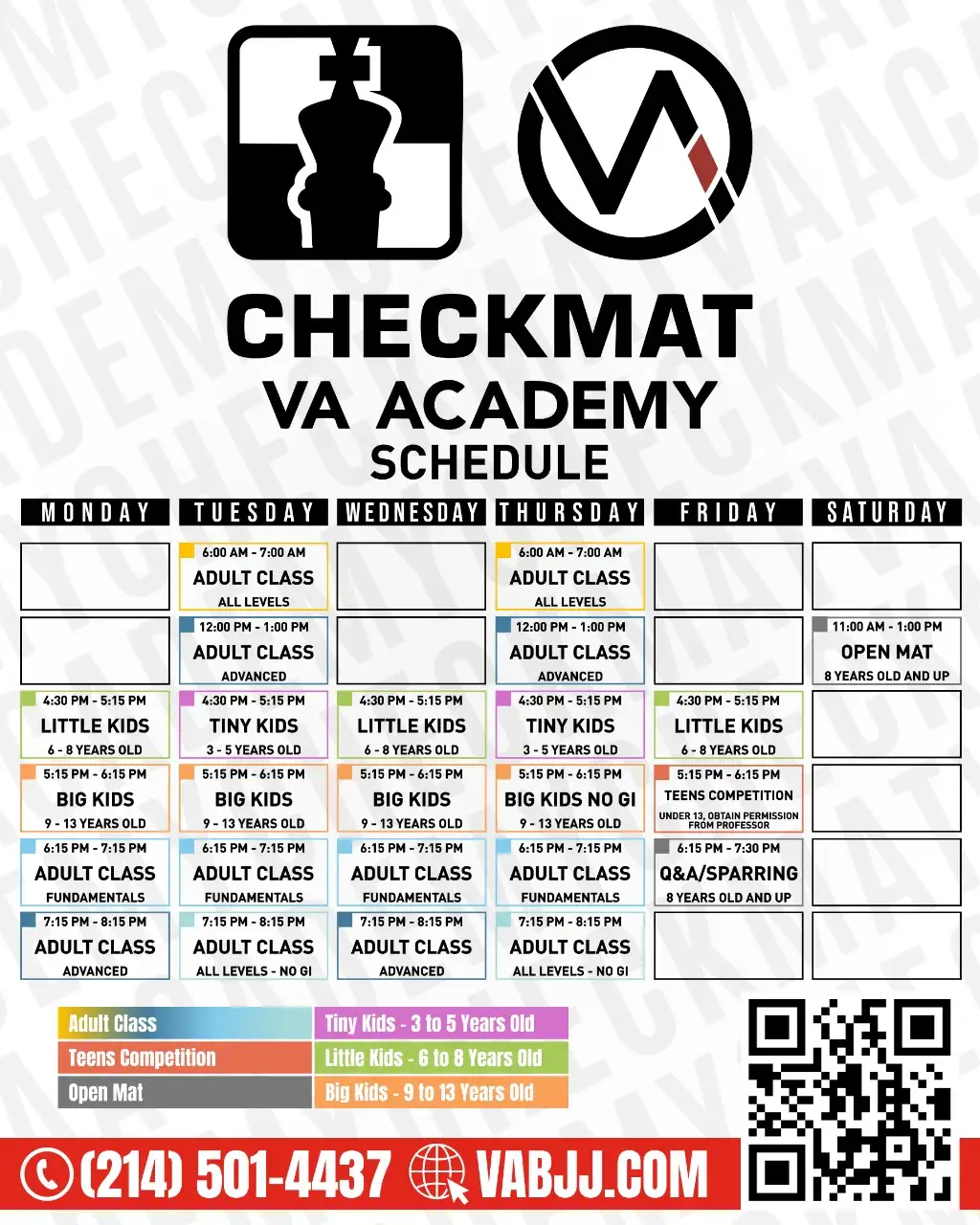 At VA Academy Jiu-Jitsu, we make it easy for you to find the perfect time to train and grow in your Jiu-Jitsu journey. Our flexible schedule offers classes for all ages and skill levels, so you can choose the sessions that best fit your routine whether you’re balancing work, school, or family life.